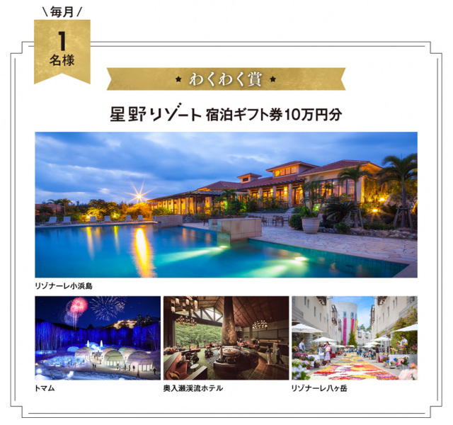 抽選で毎月21名様(合計63名様)に星野リゾート宿泊ギフト券等、